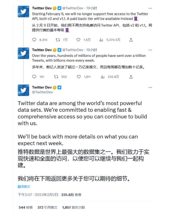 Twitter 官方開發者賬號在推文中表示:“我們宣布自 2 月 9 日開始,不再支持免費訪問 v1.1 和 v2 版本的 Twitter API,后續我們將推出付費的基礎套餐”。