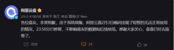 各位盤友,非常抱歉,由于系統(tǒng)故障,阿里云盤 2 月 3 日晚間出現(xiàn)了短暫的無法正常使用的情況,23:50 分已修復(fù),不影響盤友的數(shù)據(jù)和后續(xù)使用。感謝大家關(guān)心,盤盤已經(jīng)去面壁了。