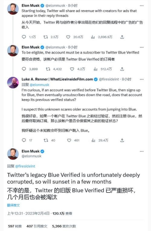 馬斯克在本周五的推文中表示:“Twitter 將于今天開始,向創(chuàng)作者分享嵌入其推文評論中的廣告收益”。
