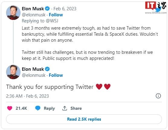 他寫道:“我不希望任何人遭受這種痛苦。推特仍然有挑戰,但如果我們堅持下去,它現在的趨勢是收支平衡。非常感謝公眾的支持!”