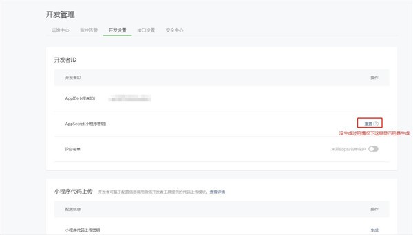 3.到設置頁面后我們可以看到第一個是AppID(小程序ID),這個參數(shù)是自帶的,無需生成,然后下面的AppSecret(小程序密鑰)是需要自己生成的,這兩個參數(shù)很重要。基本對接任何東西都需要。AppSecret沒有生成過的情況下會顯示生成,如果已經(jīng)生成過了會顯示重置。