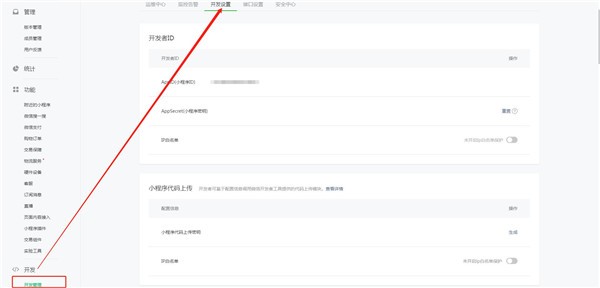 2.進入到小程序后臺在左側(cè)菜單中找到開發(fā)中的開發(fā)管理,點擊進入就可以看到AppSecret生成頁面了。