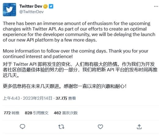 Twitter 隨后將上線日期推遲到了 2 月 13 日。但距離正式上線還有幾個小時的時候,官方現在再次發布推文,表示再推遲幾天時間。推文中并未明確具體的上線時間。