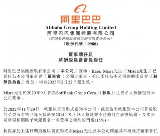 公告稱,米斯拉在 2020 年 9 月作為軟銀的提名人被推選為公司董事。2022 年 11 月 29 日,軟銀以書面形式通知阿里,截至當(dāng)天,軟銀對(duì)阿里普通股的受益所有權(quán)已降至低于按 2014 年 9 月 18 日簽訂并不時(shí)修訂之表決協(xié)議,及本公司章程相關(guān)賦予軟銀提名一名董事之權(quán)利的門檻(15%)。軟銀也于上述日期前后以書面形式向米斯拉及阿里確認(rèn)其不再維持董事會(huì)代表,米斯拉也確認(rèn)終止在董事會(huì)代表軟銀的身份。