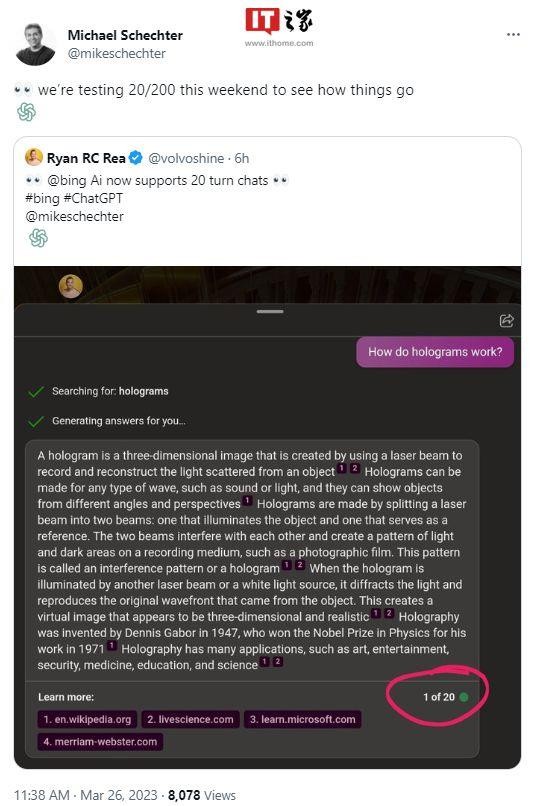 微軟必應聊天再次提高了聊天次數的限制,這個聊天機器人現在每次會話可以進行 20 次聊天,每天可以進行 200 次聊天。之前,每次會話的聊天次數上限是 15 次,每天的聊天次數上限是 150 次。