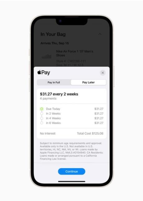 蘋果今天在美國推出了 Apple Pay Later 服務(wù),將允許消費者先購物后付費。簡單來說,Apple Pay 用戶可以將某一筆賬單分成四筆在六周內(nèi)付款,零利息且不收取任何額外費用。