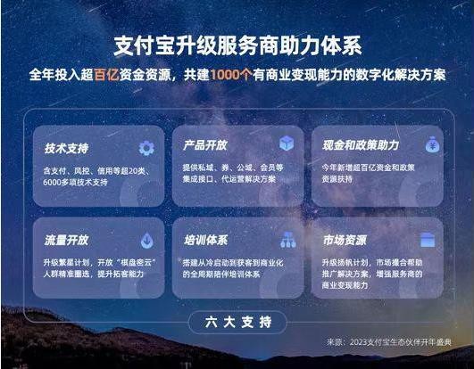 支付寶平臺宣布,升級生態服務商助力體系:通過技術支持、產品開放、培訓體系、流量開放、現金和政策助力、市場推廣資源等 6 大支持,幫服務商實現快速冷啟動、精準獲客和提高商業變現能力。