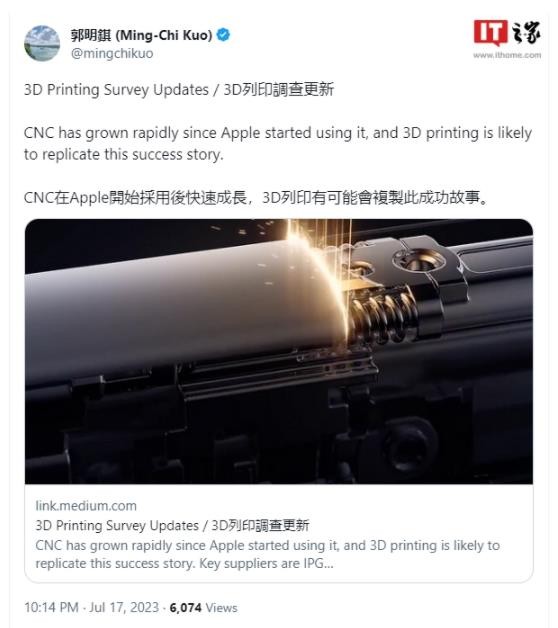 郭明錤還稱,3D 打印是加法生產,與 CNC 的減法生產相較下更不浪費,因鈦單價較高,故采用 3D 打印生產的鈦金屬件更節省成本。