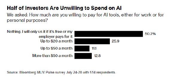 但對于今年上半年炙手可熱的 AI 技術,這些受訪者目前還沒有全力以赴地投入。其中一半的人不愿自掏腰包,購買 AI 工具來幫助他們的個人或商業生活;而大多數公司也不打算使用 AI 工具進行交易或投資。