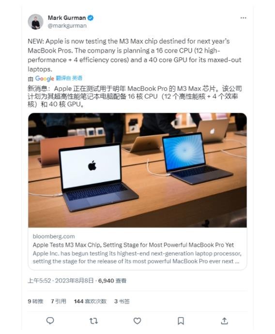 彭博社的馬克?古爾曼在今天發布的最新一期 Power On 時事通訊中,繼續爆料稱蘋果目前正在測試 M3 Max 芯片,預估將于明年隨新款 MacBook Pro 和大家見面。