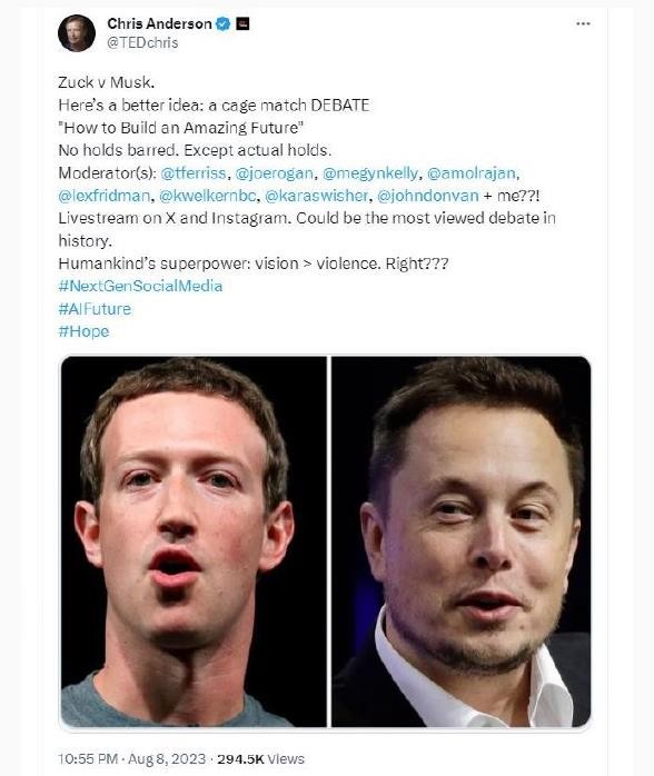 TED 演講創(chuàng)始人克里斯·安德森(Chris Anderson)發(fā)帖,建議馬斯克和扎克伯格把“籠斗”改成一場籠中辯論賽。