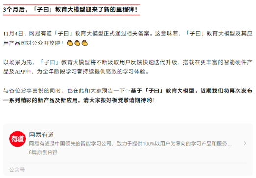 據(jù)網(wǎng)易有道官方公眾號(hào),網(wǎng)易有道“子曰”教育大模型今日通過(guò)相關(guān)備案,該大模型及其應(yīng)用產(chǎn)品將對(duì)公眾開(kāi)放。