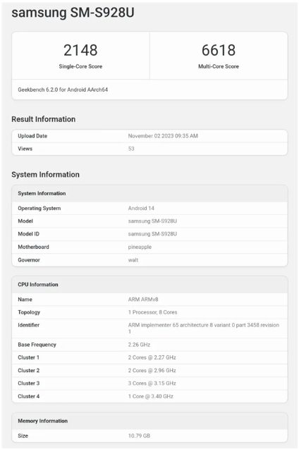 值得注意的是,驍龍8 Gen3還有一款高頻版本,現(xiàn)在它出現(xiàn)在了Geekbench跑分網(wǎng)站上,測試設備是三星Galaxy S24 Ultra,設備型號是SM-S928U。