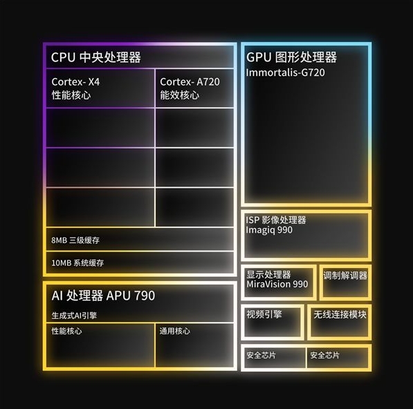 內部還集成聯發科第七代 AI 處理器 APU 790,為生成式 AI 而設計,整數運算和浮點運算的性能是前一代的 2 倍,功耗降低了 45%,支持終端運行最高 330 億參數的 AI 大語言模型。