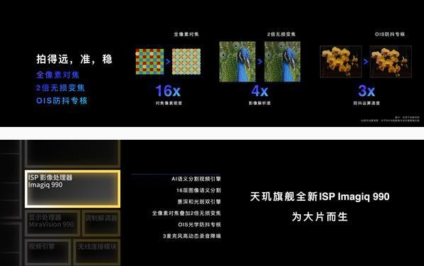 全新旗艦 ISP Imagiq 990 是安卓首款支持獨立防抖專核、首款支持 3 麥克風 HDR 立體聲錄音降噪,還支持 AI 語意分割視頻引擎、16 層圖像語意分割、景深和光斑雙引擎、全像素對焦疊加 2 倍無損變焦等,是目前最強大的 ISP 之一。