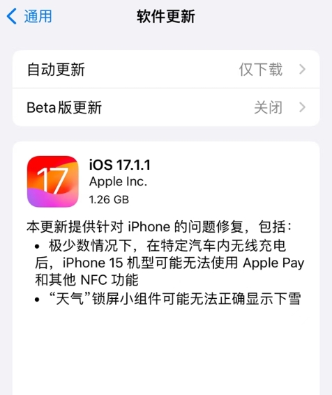 更新修復了在極少數情況下,在特定汽車內無線充電后,iPhone 15機型可能無法使用Apple Pay和其他NFC功能。