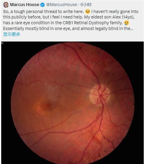 事情是這樣的,周二知名澳洲科技媒體人 Marcus House 在社交媒體上發文稱,他 14 歲的大兒子亞歷克斯患有 CRB1 視網膜營養不良癥這一罕見的眼病。