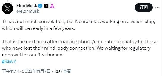 隨后,日常高強度網上沖浪的馬斯克回復了這條帖子。世界首富表示:“雖然這可能并不能給你太多安慰,但是 Neuralink 正在研發一種視覺芯片,預計幾年后就能完成。在幫助那些失去了身體與大腦連接的人實現手機/電腦心靈感應之后,這是我們的下一個研究領域。我們正在等待監管部門批準我們的第一位人類實驗對象。”