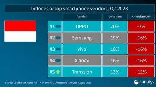 憑借部分可借鑒的市場經驗與極具競爭力的產品,中國手機廠商們在印尼智能手機市場如魚得水。據調研機構Canalys的最新統計,2023年二季度在印度尼西亞市場,OPPO以20%份額位列第一,三星緊隨其后,份額為19%,vivo、小米和傳音分別位列第三至第五,市場份額分別為18%、16%和13%。