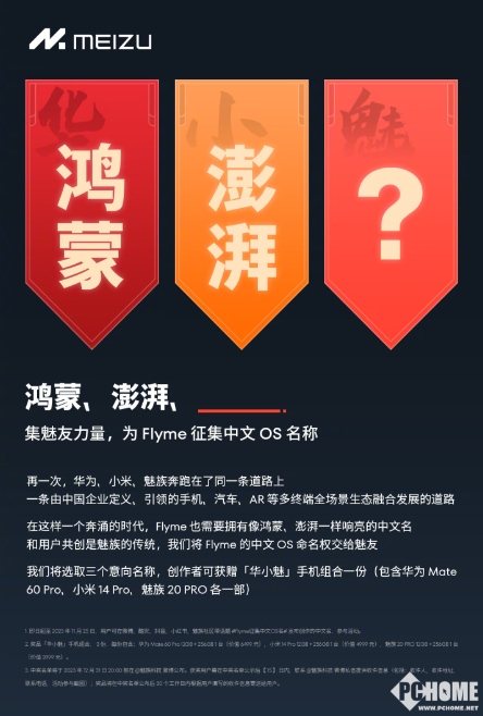 據(jù)悉,魅族向用戶整機(jī)Flyme的中文OS命名,之后會(huì)選取三個(gè)意向名,創(chuàng)作者可獲贈(zèng)“華小魅”手機(jī)組合一份(包含華為Mate 60 Pro、小米14 Pro、魅族 20 PRO各一部)。