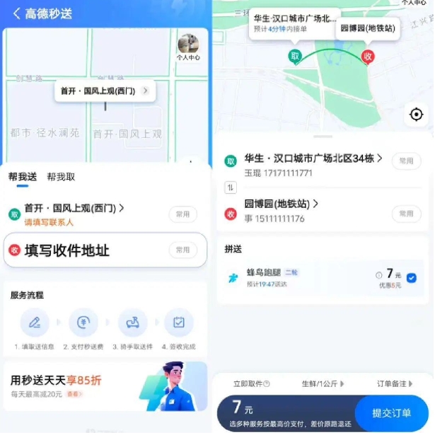 報道稱,高德秒送的入口位于高德地圖 App 的個人中心內。進入該服務后,可以看到配送取件頁面,包括“幫我送”和“幫我取”服務。