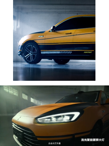 從圖中可以看到,該套裝是汽車的外觀配色內容,采用了黃、黑線條和色塊進行涂裝,“曙光黃”作為唯一主題色,確實看起來更加有動感。