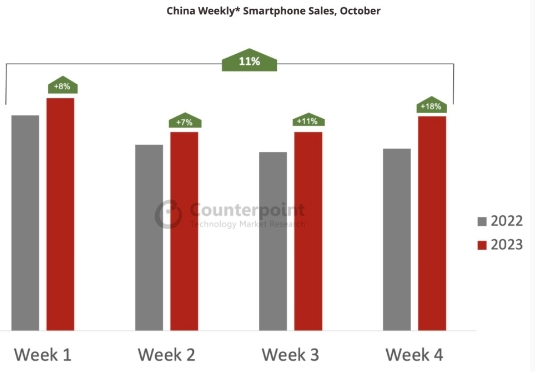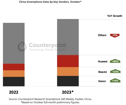 市場調查機構 Counterpoint Research 公布的最新數據顯示,華為和小米引領中國智能手機市場復蘇,10 月份實現了兩位數增長。