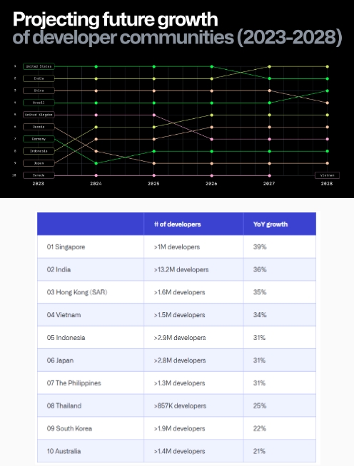預(yù)計(jì)到 2027 年,印度將取代美國(guó)成為 GitHub 上最大的開發(fā)者社區(qū)。新加坡今年是亞太地區(qū)開發(fā)者人數(shù)增長(zhǎng)最快的國(guó)家,并且是開發(fā)者占總?cè)丝诘谋壤罡叩牡诘貐^(qū)(全球范圍內(nèi))。報(bào)告指出,由于日本在技術(shù)和初創(chuàng)企業(yè)方面的進(jìn)一步投資,明年日本的開發(fā)者將有持續(xù)增長(zhǎng)。
