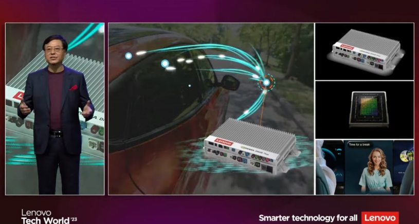 楊元慶在演講時介紹了聯(lián)想車計算的產(chǎn)品布局,他指出,未來智能汽車更像是輪子上的超級 PC,對汽車性能標(biāo)準(zhǔn)的衡量也從馬力變成了算力,聯(lián)想車計算的域控產(chǎn)品將支持智能座艙、自動駕駛和智慧屏幕等,基于汽車場景的大模型也將化身智能伴侶,了解用戶、幫助用戶和陪伴用戶。