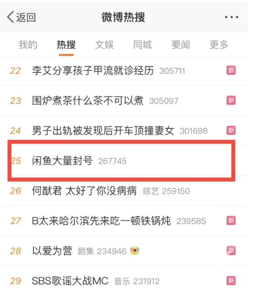 昨日,有網友反映二手交易平臺閑魚大量封號,隨后這一話題還登上了熱搜。
