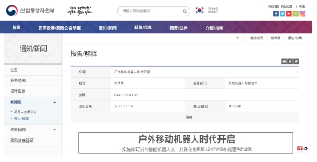 韓國產業通商資源部和警察廳聯合宣布,隨著《智能機器人法》 ( 2016 年 5 月 23 日修訂、 2017 年 11 月 23 日實施)和《道路交通法》( 2018 年 4 月 23 日修訂、2019 年 10 月 23 日實施)修訂實施,戶外移動機器人獲得駕駛安全認證,授予行人身份,允許在人行道通行。