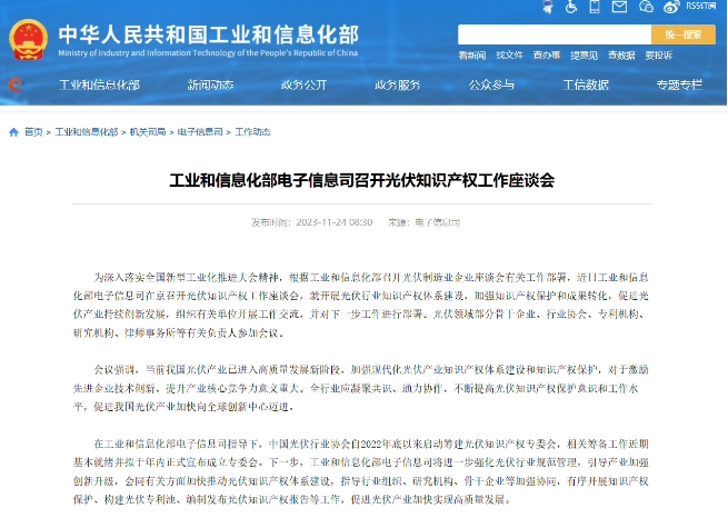 據工業和信息化部官網消息,近日工業和信息化部電子信息司在京召開光伏知識產權工作座談會,就開展光伏行業知識產權體系建設,加強知識產權保護和成果轉化,促進光伏產業持續創新發展,組織有關單位開展工作交流,并對下一步工作進行部署。光伏領域部分骨干企業、行業協會、專利機構、研究機構、律師事務所等有關負責人參加會議。