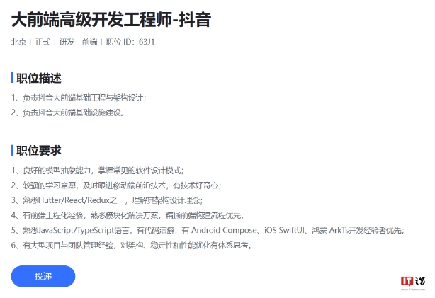 其中,字節跳動上線了“大前端高級開發工程師”一職,主要負責抖音大前端基礎工程與架構設計、大前端基礎設施建設。該崗位需要有前端工程化經驗,熟悉 JavaScript / TypeScript 語言,有代碼潔癖;有 Android Compose、iOS SwiftUI、鴻蒙 ArkTs 開發經驗者優先。