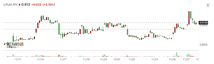 消息公布后,在納斯達克上市的Lilium股價一度跳漲超10%,最高報每股0.970美元。現漲幅收窄至3.70%,報每股0.913美元。