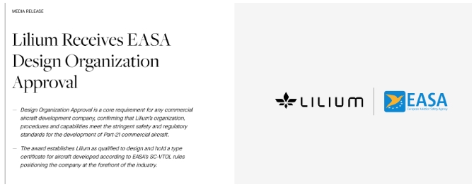 德國“電動垂直起降飛行器”(eVTOL)開發商Lilium N.V.在官網宣布,公司收到了歐盟航空安全局(EASA)頒發的“設計機構批準”(Design Organization Approval,DOA)。