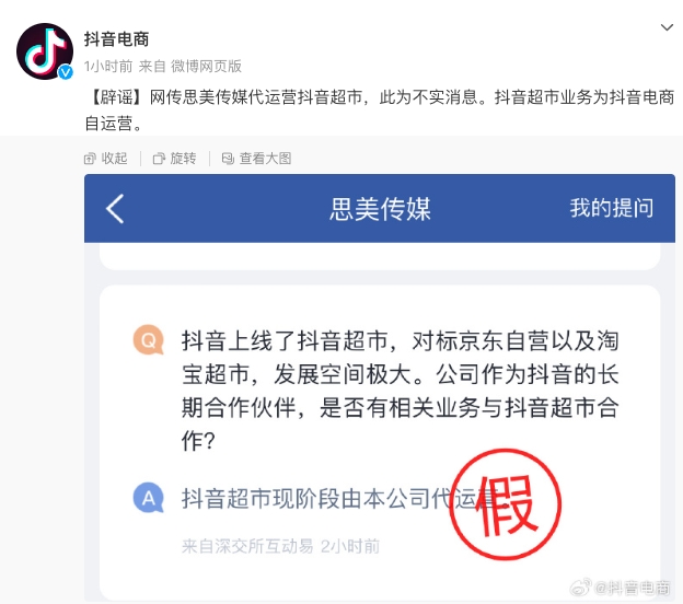 昨日,抖音電商辟謠:網(wǎng)傳思美傳媒代運營抖音超市,此為不實消息。抖音超市業(yè)務為抖音電商自運營。
