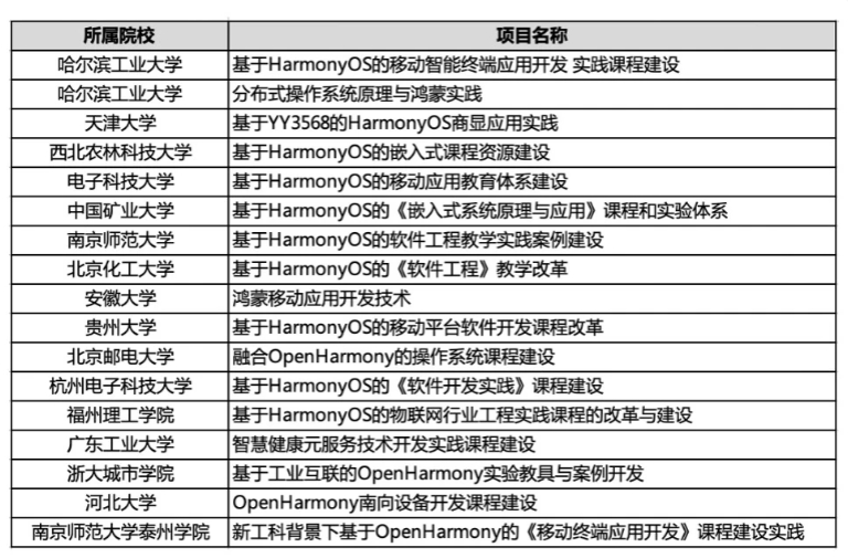 此外,根據華為人才在線官網的最新公示信息,2023 年教育部產學合作協同育人項目的華為第二批項目已經立項公示,其中包括哈爾濱工業大學、天津大學、電子科技大學等 16 個知名高校的鴻蒙項目。在此之前,諸如清華大學、北京航空航天大學、武漢大學等 985 高校已經率先開設了 HarmonyOS 的相關課程。