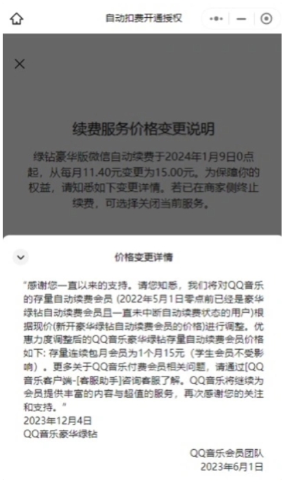 有網(wǎng)友反饋,QQ 音樂日前向微信用戶發(fā)送“續(xù)費服務(wù)價格變更提醒”:2024 年 1 月 9 日 0 點起,綠鉆豪華版微信自動續(xù)費的費用將從 11.4 元 / 月變更至 15 元 / 月。