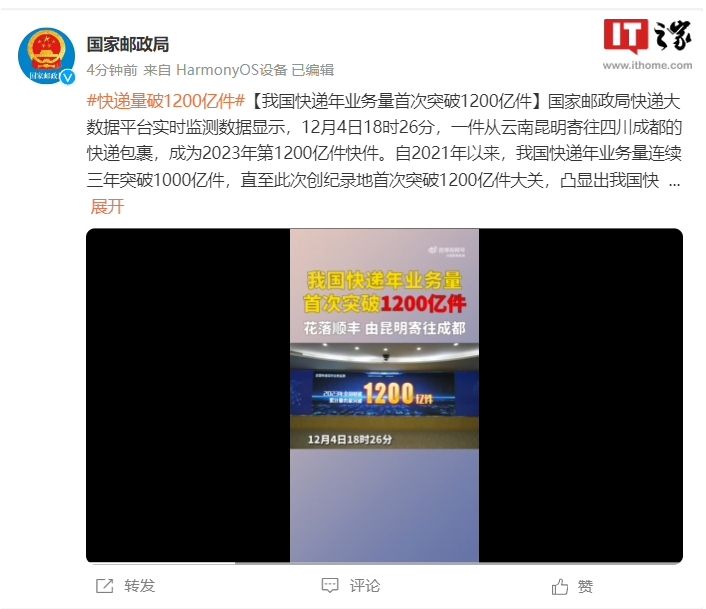 隨著一件由順豐速運承運的訂購鮮花從云南昆明寄往四川成都,國家郵政局快遞大數據平臺實時監測數據顯示,今年我國第 1200 億件快件正式產生,至此我國快遞年業務量首次突破 1200 億件大關,再創歷史新高。