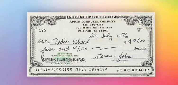 這張支票于 1976 年 7 月 23 日由喬布斯親筆簽名,采用蘋果公司特殊的 6*3 支票設計,由喬布斯支付給 Radio Shack,開票金額為 4.01 美元。