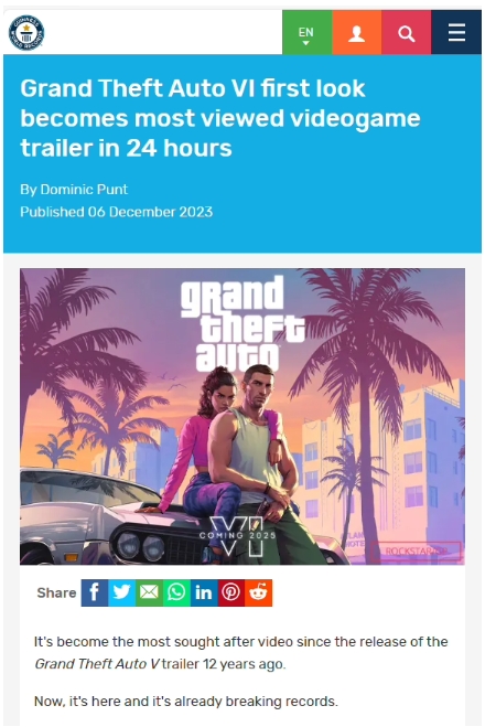 吉尼斯世界紀錄官網當地時間 6 日發文宣布,《GTA 6》的首部預告片打破了三項吉尼斯世界紀錄。
